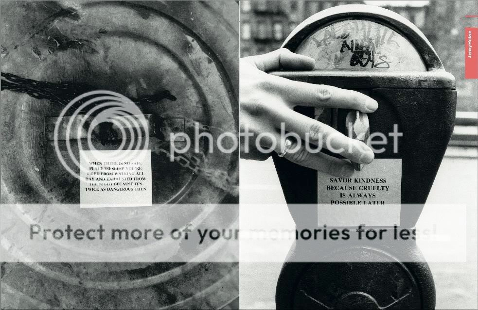 Jenny started off with her own phrases and words, but ever since 1993 she started to make other people's words into art. Jenny Holzer's art always gets a response, whethere good or bad from the people who view it, she talks about very bold situations or topics.